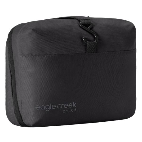 The Pack-It Hanging Toiletry Kit organizes toiletries with elastic and zippered pockets that secure bottles in place, and dual compartments separate contents plus its water-resistant fabric protects against splashes and accelerates the cleanup of spills or leaks.